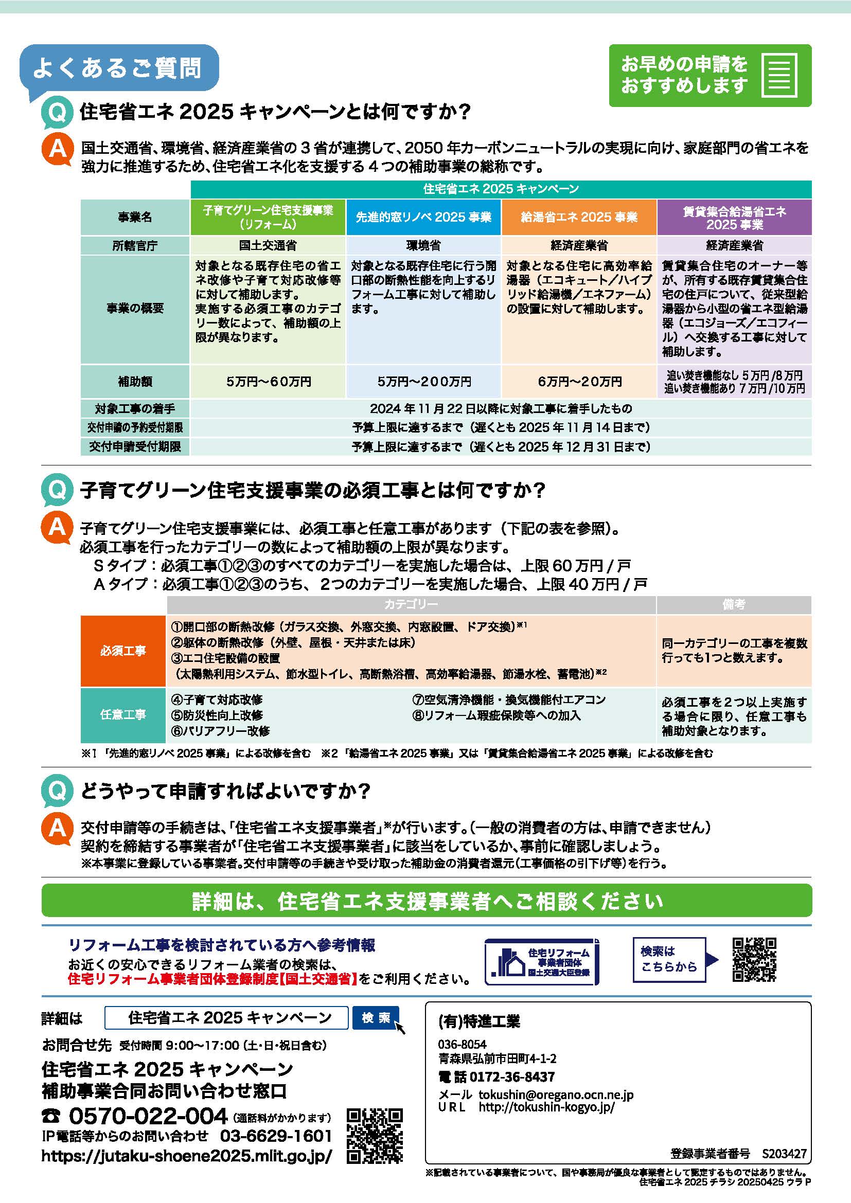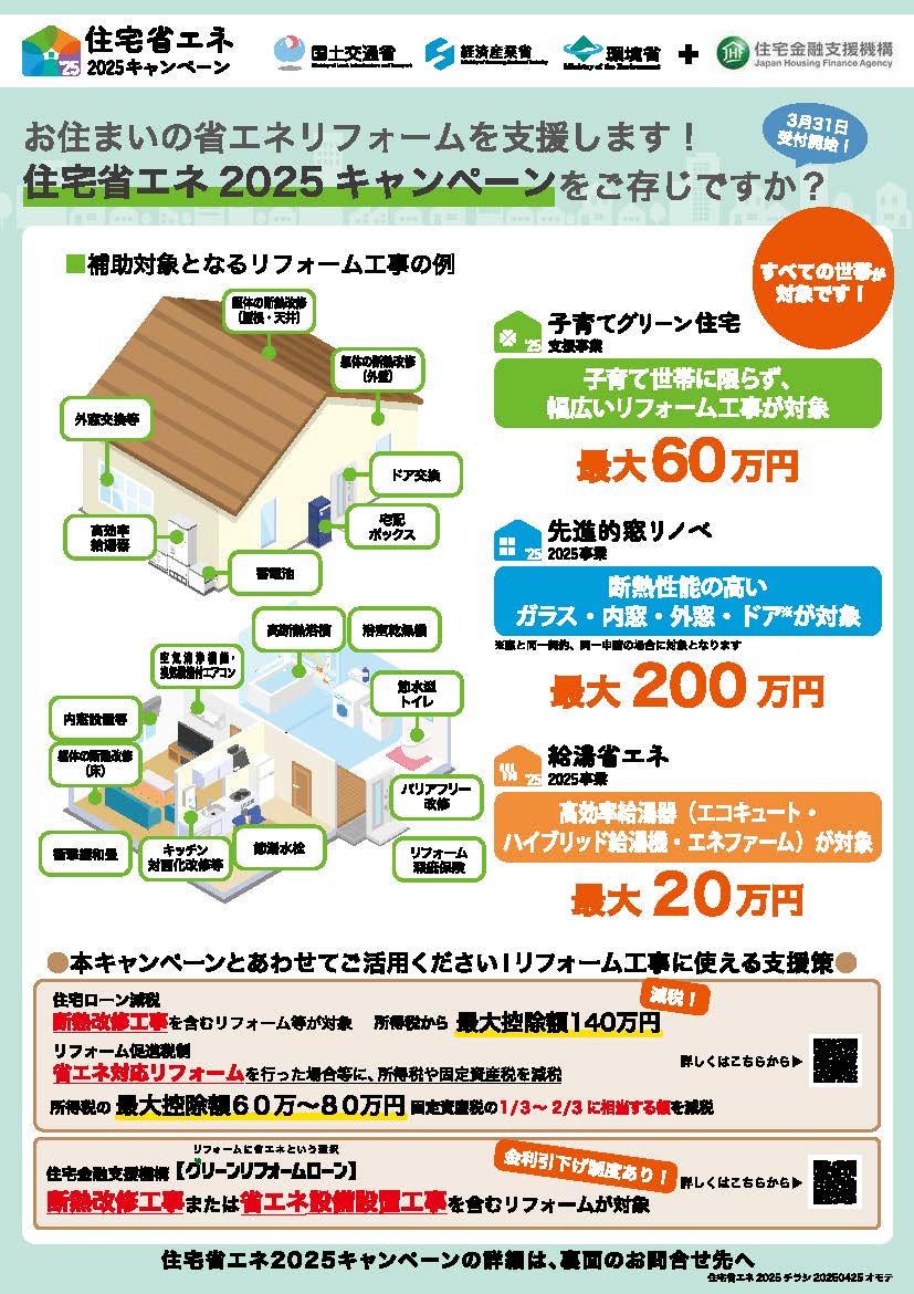 お知らせ 住宅省エネ2025キャンペーン 2025.09.25 既存住宅のリフォームが活用できる補助金のほか、新築住宅が活用できる補助金の制度があります。 ご興味のある方は、お気軽にお問い合わせください。 キャンペーンの詳しい情報はこちら! 住宅省エネ2025キャンペーン【公式】 Post Share Hatena Pocket RSS feedly Pin it 昨日コレ食べた 2 前の記事